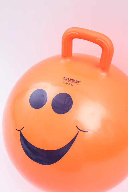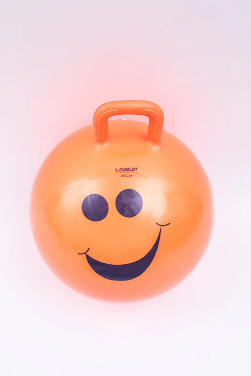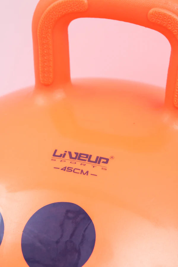 Children's gymnastics ball LiveUp Hopping Ball made of durable, easy to clean and non-toxic PVC material. For greater safety of children, this model is equipped with a handle and technology Anti-Burst. The kit also includes a pump.