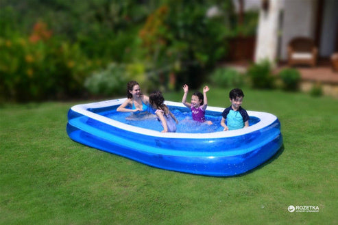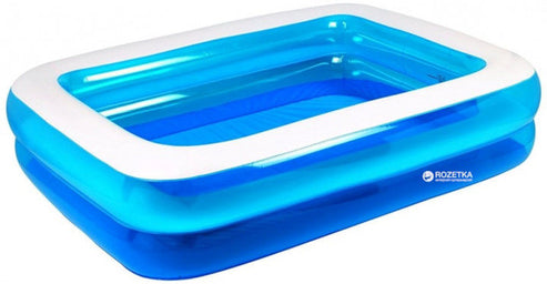 Inflatable pool Jilong 10291 (262x175x50), rectangular design, designed for several people. In height, the pool consists of two horizontal separate chambers, with outlet valves, also has a convenient, separate drain valve for draining water. Translucent walls are made of high-quality vinyl blue. The top of the pool is reinforced with white vinyl tape, which will extend the life of the product. Due to its width, it is comfortable to sit on the chamber, and children can play on it.
