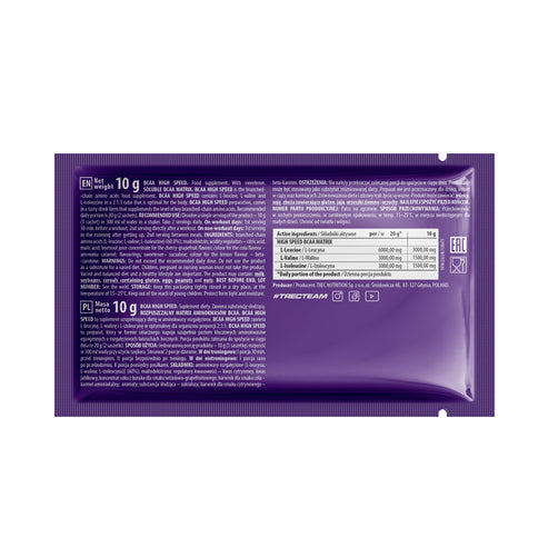 BCAA HIGH SPEED is a high-quality branched-chain amino acid, including L-leucine, L-valine and L-isoleucine in a balanced ratio of 2:1:1. These amino acids play a key role in the recovery and maintenance of muscle mass, which makes the product indispensable for athletes and active people.