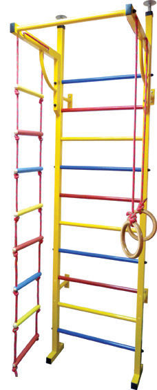 It consists of a ladder with multi-colored crossbars to develop a child's vivid perception of the surrounding world, a horizontal bar on which the whole family can pull themselves up, even the head of the family (maximum user weight up to 150 kg), a rope ladder, which serves to strengthen the sense of balance and develops the ability to climb, as well as rings for performing hangs, stops, flips and other gymnastic elements.