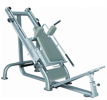 The machine is designed for performing hack squats and leg presses. The angle of the metal back is adjustable.