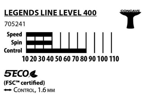 Legends 400 FSC is a basic racket of good quality for sports in leisure and school. This racket is equipped with a fairly smooth rubber with "pimples", approved by ITTF. The 1.6 mm thick sponge, located between the rubber and the blade, provides the necessary power and at the same time great control for the beginner and casual player.