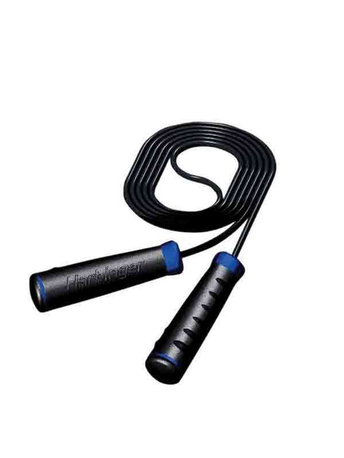 A quality jump rope from Harbinger featuring cast handles with steel bearings for a secure grip and smooth movement. The length is adjustable.