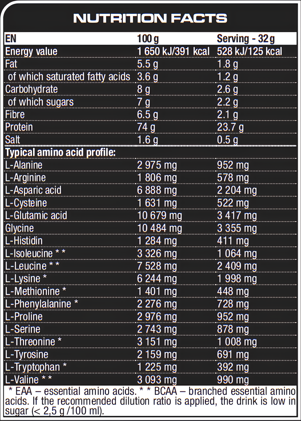 Recommended dose: Mix a 32 g serving (3/4 of a measuring spoon) with 250 ml of water. Take 1-3 servings daily between meals, depending on your daily protein requirements.