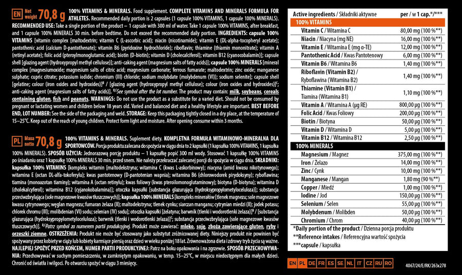 Ингредиенты: Витаминный комплекс (мальтодекстрин, витамин С, ниацин, витамин Е, пантотеновая кислота, витамин В6, рибофлавин, тиамин, витамин А, фолиевая кислота, биотин, витамин D, витамин B12); оболочка капсулы (желатин). Минеральный комплекс (оксид магния, магниевые соли лимонной кислоты, карбонат магния, железа (II) фумарат, мальтодекстрин, оксид цинка, сульфат марганца, цитрат меди, йодистый калий, хлорид хрома, молибдат натрия, селенат натрия); оболочка капсулы (желатин); антислеживающий агент - магниевые соли жирных кислот.