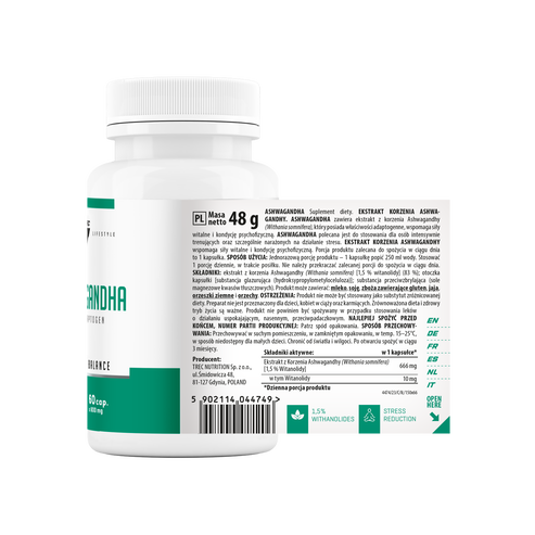 ИНГРЕДИЕНТЫ: экстракт корня ашваганды (Withania somnifera) [1,5% витанолида] (83%); оболочка капсулы [глазирователь (гидроксипропилметилцеллюлоза)]; антислеживатели (магниевые соли жирных кислот).