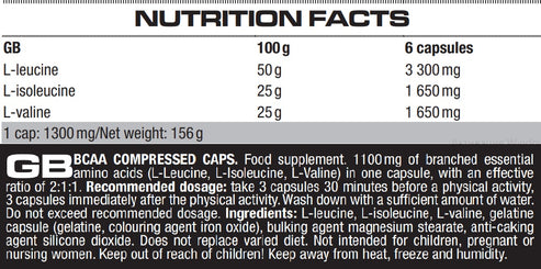 Состав: L-лейцин, L-изолейцин, L-валин, желатиновая капсула (желатин, красители диоксид титана и оксид железа), наполнитель стеарат магния, антислеживающий агент диоксид кремния.