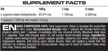 AAKG — это предтренировочная добавка, рекомендованная спортсменам при максимальной интенсивности тренировок. Аргинин — это аминокислота, из которой в организме вырабатывается оксид азота, расширяющий кровеносные сосуды (вазодилатация) и нормализующий кровяное давление. Прием AAKG перед тренировкой усиливает вазодилатацию сосудов, улучшая поступление кислорода и питательных веществ к мышцам, благодаря чему мышцы работают с большей интенсивностью.