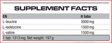 Ингредиенты: L-лейцин, L-изолейцин, L-валин, наполнитель микрокристаллическая целлюлоза, агент против слеживания стеарат магния, наполнитель натриевая соль карбоксиметилцеллюлозу, глазирователь гидроксипропилметилцеллюлоза.