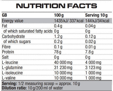 Ингредиенты: растворимая смесь BCAA (L-лейцин, L-изолейцин, L-валин, эмульгатор соевый лецитин), L-глютамин, регулятор кислотности лимонная кислота, ароматизатор, подсластители сукралоза и ацесульфам К, антислеживающие агенты фосфат кальция и диоксид кремния, краситель бета-каротин.