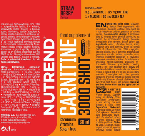 CARNITINE 3000 SHOT - это специализированный жиросжигатель в виде жидкого концентрата, разработанный для максимизации результатов во время тренировок. Основной активный компонент, L-карнитин Carnipure®, отвечает за транспортировку жирных кислот в митохондрии мышечных клеток, где они окисляются для получения энергии. Такой механизм позволяет организму более эффективно использовать жировые запасы в качестве топлива. Кроме того, препарат содержит таурин, кофеин, экстракт зеленого чая и витамины группы B, которые работают в синергии для усиления эффекта сжигания жира. Результат - повышение выносливости, снижение усталости и активное снижение веса даже при умеренных нагрузках.