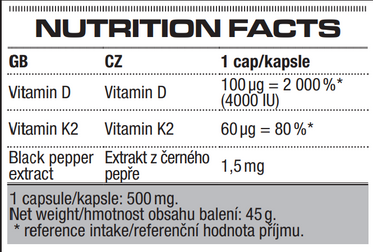 Состав: мальтодекстрин, желатиновая капсула (желатин, краситель оксид железа), масло MCT (триглицериды средней цепи, сироп глюкозы и молочный белок, эмульгатор E 472c), холекальциферол (витамин D3), наполнитель стеарат магния, экстракт черного перца (95 % пиперина) – Bioperine®, менахинон-7 (витамин K2).