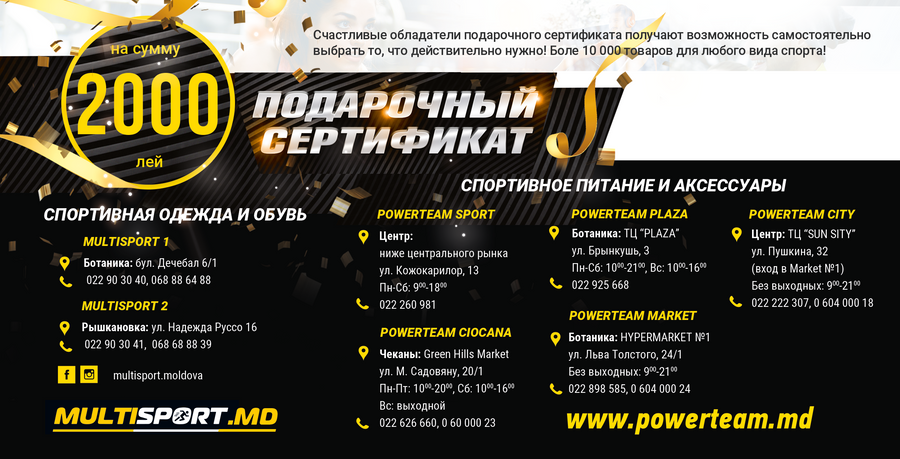 Proprietarul certificat de cadouri primește ocazia de a alege ceea ce are nevoie! Mai mult de 2000 de produse de nutriție sportivă și accesorii pentru sport și fitness.