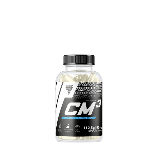 CM3 TRI CREATINE MALATE este un compus derivat din creatină monohidrat și acid malic. Această combinație este specifică prin aceea că menține toate proprietățile pozitive ale creatinei monohidrat. Creatina malat este o formulă îmbunătăţită de creatină – în 3 molecule de creatină este adăugat acid malic, datorită căruia are această formulă de creatină are o solubilitate şi stabilitate mai bună. TRI CREATINE MALATE este mai rezistent la acidul gastric și previne transformarea creatinei monohidrat în creatinină. Creatina creşte performanţa fizică în timpul antrenamentelor repetate de scurtă durată şi mare intensitate.