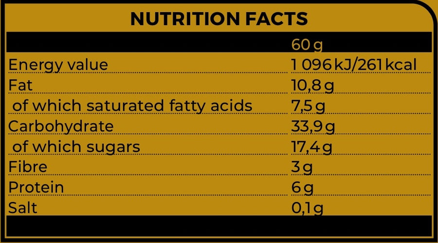 Ingrediente: sirop de glucoză-fructoză, amestec de ovăz 13,5% (fulgi de ovăz, tărâțe și extrudat), ciocolată cu lapte 13% (zahăr, unt de cacao, masă de cacao, lapte praf integral, emulgatori lecitină de soia și E 476, extract de vanilie), sirop de glucoză, extrudat de proteine de mazăre, nuci, smântână cu alune de pădure (zahăr, ulei de palmier și shea, zer uscat, alune de pădure, cacao, emulgator lecitină de floarea soarelui, aromă), grăsime vegetală (miez de palmier, palmier, shea), izomaltuloză - Palatinose TM (este o sursă de fructoză și glucoză), extrudat de soia cu cacao (soia izolat proteic, cacao), fulgi de soia, glicerină umectant, boabe de cacao zdrobite, cacao, melasă uscată (melasă, maltodextrină), gumă de salcâm, aromă, emulgator lecitină de rapiță, amestec antioxidant de tocoferoli naturali. Poate conține urme de alte nuci, arahide și susan.