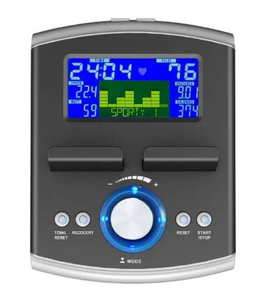• Consola de antrenament cu display LCD cu urmatoarele date: timp, viteza, rotatii pe minut, distanta, calorii arse, wati, puls.