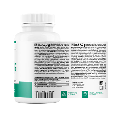 Preparatul este fabricat din rădăcinile de ginseng coreean (Panax ginseng) selectate cu grijă și de înaltă calitate, ceea ce garantează puritatea și eficacitatea materiei prime. Extractul este standardizat pentru a conține minimum 10% ginsenoside - componente active responsabile de proprietățile vindecătoare ale plantei. Concentrația ridicată de ginsenoside în fiecare porție asigură un efect puternic și rapid, care distinge acest preparat de suplimentele obișnuite de ginseng. Preparatul este disponibil sub formă de capsule pentru ușurință de utilizare și dozare precisă. Compoziția naturală fără aditivi artificiali face preparatul sigur pentru utilizare pe termen lung ca terapie de susținere.
