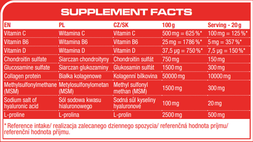 Ingrediente grapefruit: colagen hidrolizat din porc, maltodextrină, L-prolină, sulfat de glucozamină de potasiu (originat din crustacee), acid citric regulator de aciditate, MSM (metilsulfonilmetan), sulfat de condroitină (l-arome aromatizante, acid citric, acid malic regulator de aciditate), agenți antiaglomeranți (fosfat de calciu și dioxid de siliciu), indulcitori (acesulfam K și sucraloză), acid hialuronic (sare de sodiu), naringină aromatizatoare, clorhidrat de piridoxină (vitamina B6), colecalciferol (vitamina D).