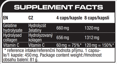 Produsul este în formă de capsule de gelatină, conține hidrolizat de gelatină (97% proteină de colagen) și vitamina C.